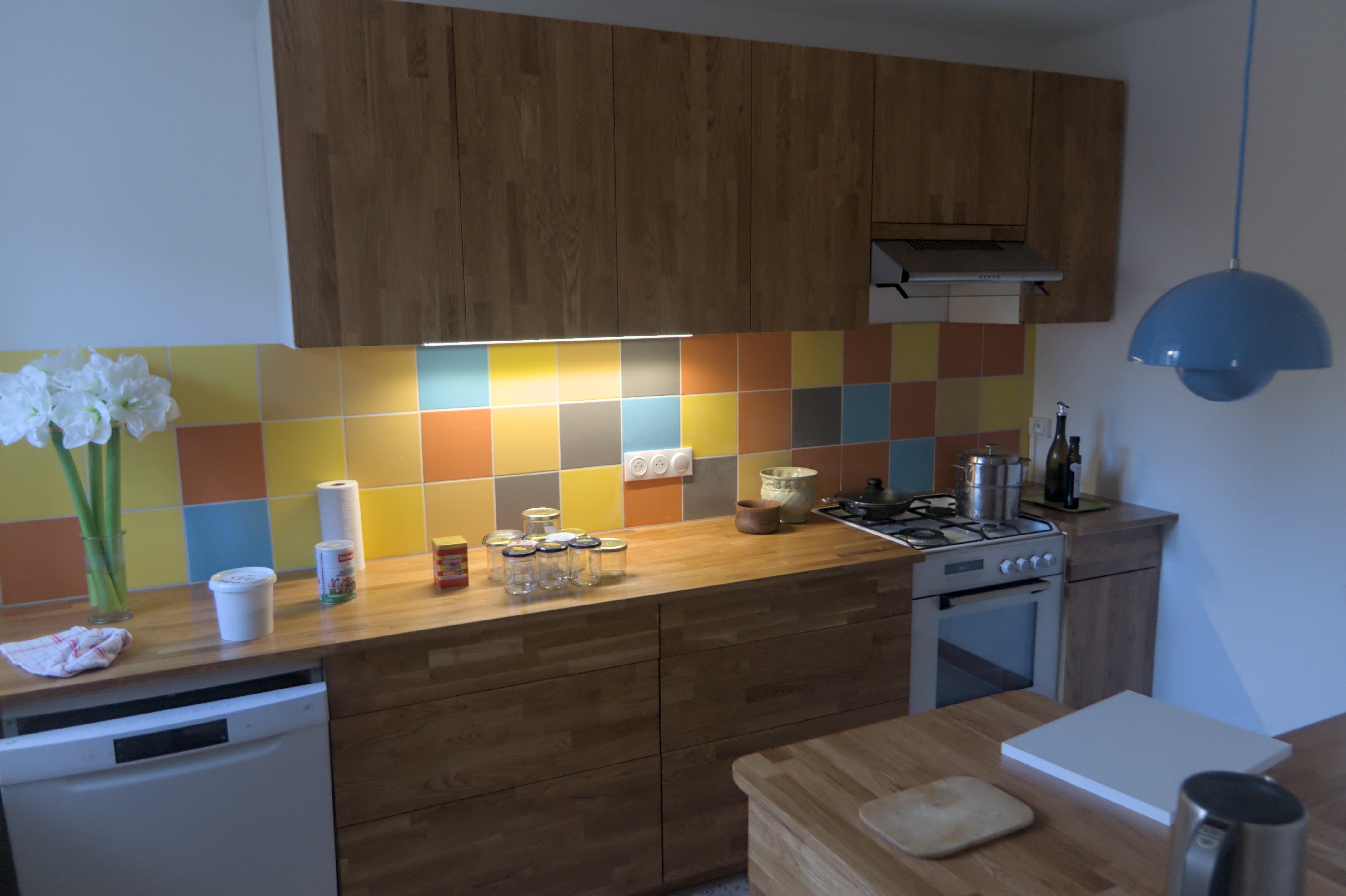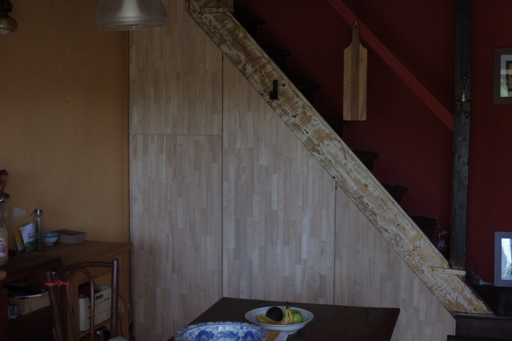 Cet escalier-bibliothèque a été réalisé en panneaux d'hévéa lamellé-collé.